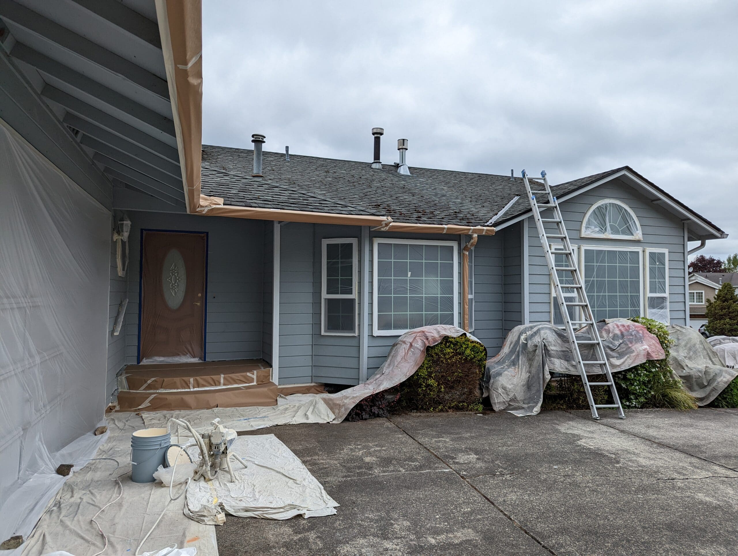 For this exterior repaint, the homeowner wanted to retire the tired blue-gray siding and give the house a warmer, more welcoming look without doing a full remodel. Our crew started with detailed prep—washing, scraping, caulking, and carefully masking every window, plant, and step—then sprayed a new buttercream body color with crisp white trim to brighten the entire property and boost curb appeal. You’ll notice the garage doors stayed gray; the owner has plans to replace them soon, so we focused the budget where it mattered most right now: long-lasting coatings on the siding, fascias, and trim. The result is a clean, refreshed exterior that feels new again and sets the stage for the future garage door upgrade.